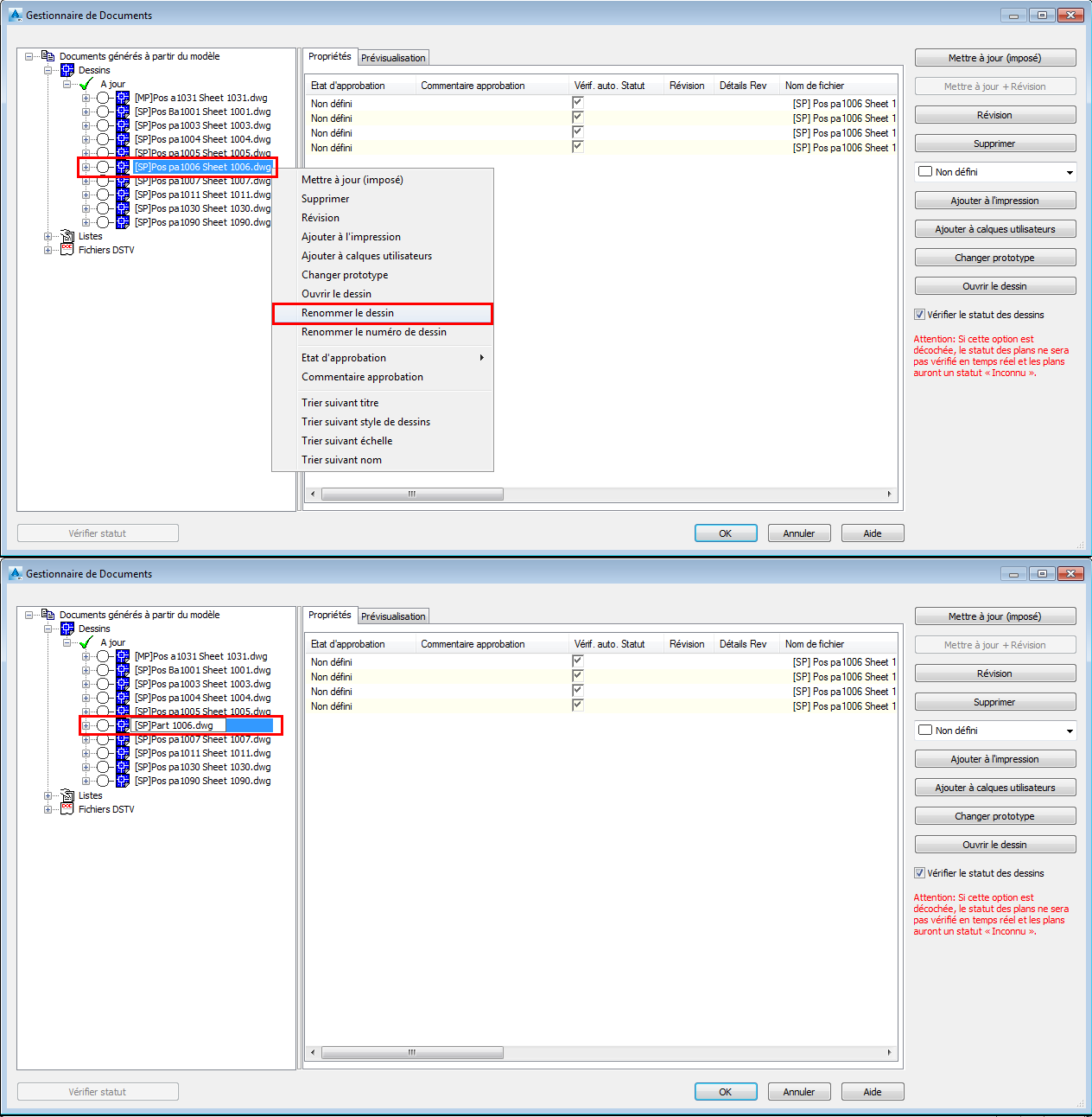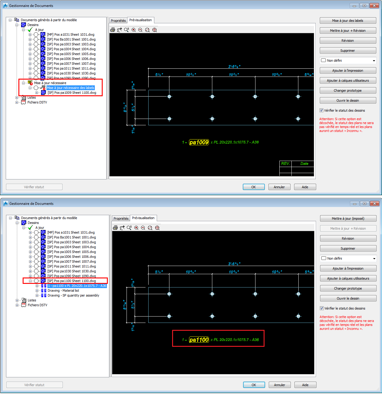 Vous pouvez mettre à jour des dessins directement à partir du Gestionnaire de documents. En outre, vous pouvez contrôler le comportement du Gestionnaire de documents lié à la vérification de l'état de détail.
