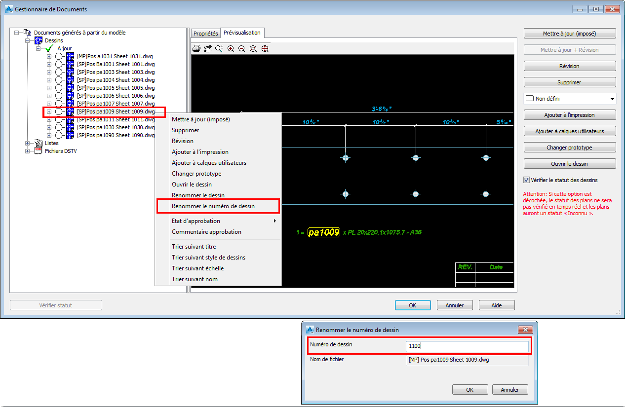 Le dessin renuméroté dans l'exemple était : [SP] Pos pa1009 Sheet 1009.dwg