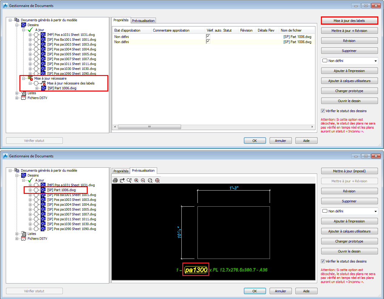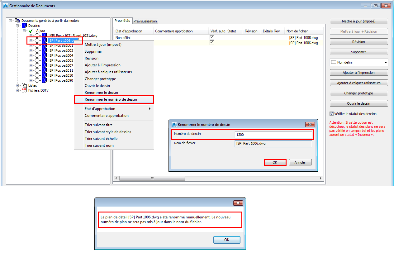 Si vous modifiez un nom de fichier à l'aide de la commande Renommer le dessin et si vous le renumérotez à l'aide de la commande Renommer le numéro de dessin, un message d'avertissement s'affiche, indiquant que le "...nouveau numéro de dessin ne sera pas mis à jour dans le nom du fichier". Le dessin de détail sera classé dans la catégorie Mise à jour des labels.