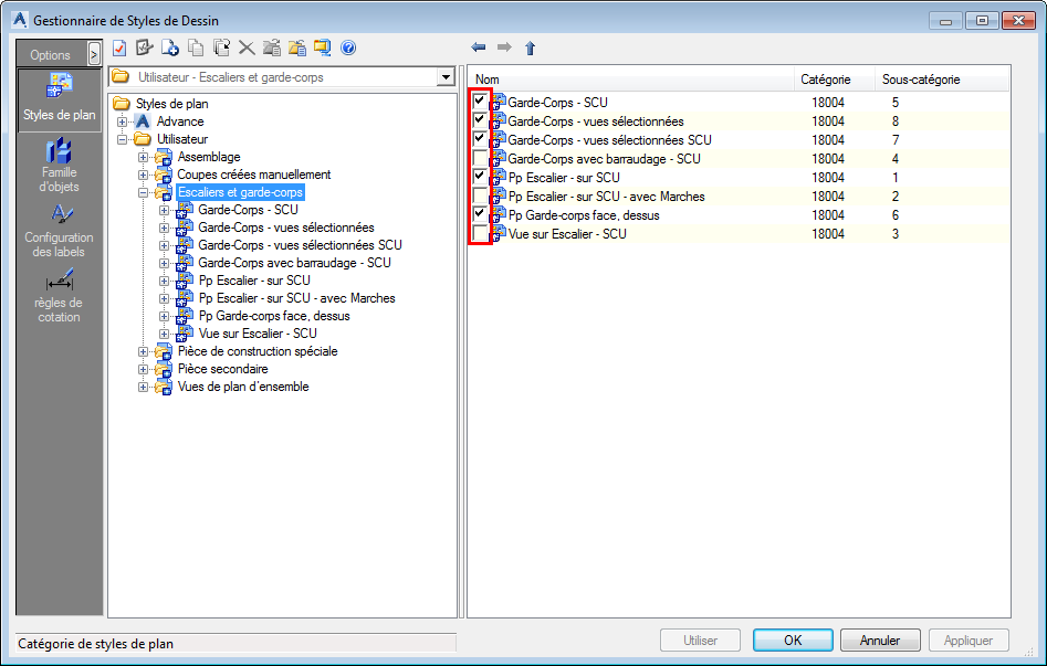 - Dans la partie droite de la fenêtre, cochez la case correspondant aux styles de dessin que vous souhaitez afficher dans la Palette des styles de dessin.