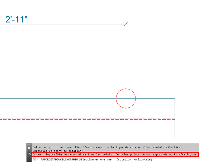 Important : Notez que si vous sélectionnez un point de cotation incorrect pour définir une ligne de cotation, le point de cotation incorrect est mis en surbrillance avec un cercle rouge dans le dessin de détail, et un message s'affiche dans la ligne de commande vous avertissant que tout point incorrect sera supprimé après la mise à jour. Si vous souhaitez créer une cotation définie uniquement par deux points et qu'au moins l'un des points est incorrect, l'intégralité de la cotation sera supprimée après la mise à jour. Assurez-vous que tous les points que vous sélectionnez pour définir la ligne de cotation sont corrects.
