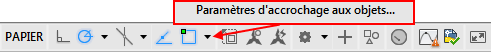 Remarque : Pour accéder à la boîte de dialogue Paramètres de dessin, cliquez sur la petite flèche en regard de la commande Accrochage aux objets dans la partie inférieure droite de l'espace de travail et sélectionnez Paramètres d'accrochage aux objets :