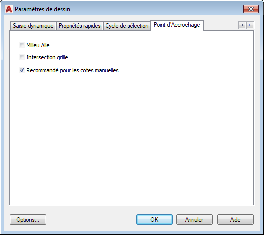 Cette option est disponible lors de la création ou de la modification des cotations Advance Steel. Vous pouvez gérer la case à cocher de ce point d'accrochage en accédant à l'onglet Point d'Accrochage de la boîte de dialogue Paramètres de dessin AutoCAD :