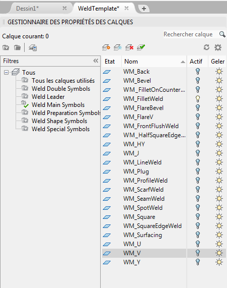 - Ouvrez le fichier "WeldTemplate.dwg" situé sous ...\ProgramData\Autodesk\Advance Steel 2020\ [EXTENSION DE LA LANGUE D'INSTALLATION]\Shared\Support\Symbols