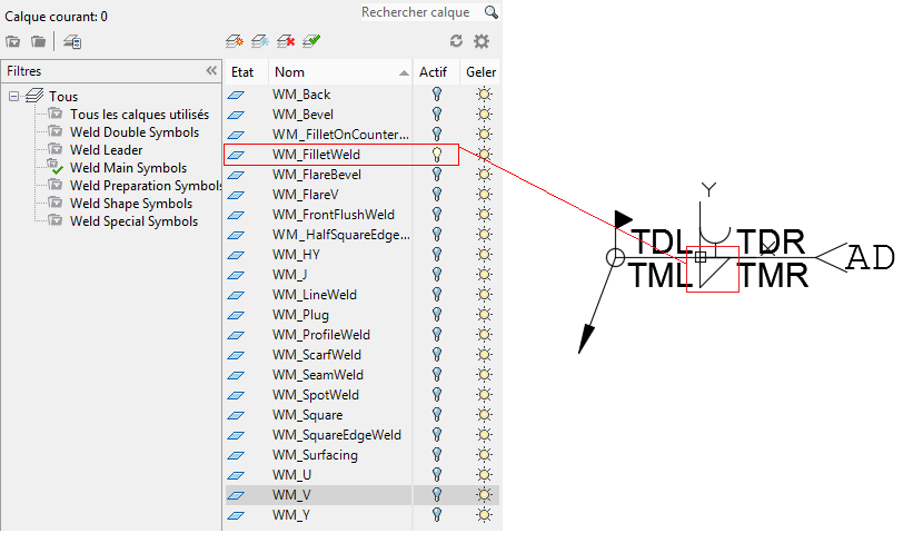 Remarque : En commençant par Advance Steel 2016, chaque symbole de soudure est dessiné sur un calque distinct (par exemple, les symboles de soudure d'angle sont dessinés sur les calques WM_FilletWeld et WD_FilletWeld).