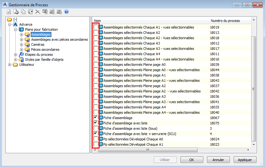 - Dans la partie droite de la fenêtre, cochez la case correspondant aux plans pour fabrication que vous souhaitez afficher dans la palette Plans pour fabrication.