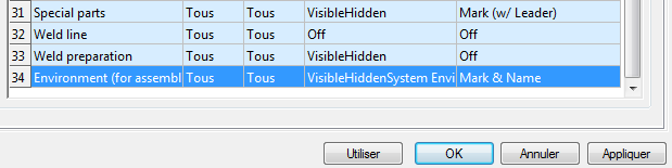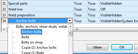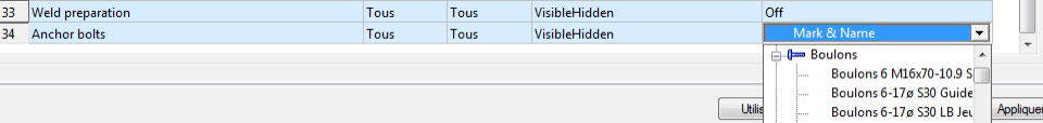 (Ajouter une présentation des objets). Cela vous permet d'ajouter une ligne au bas de la liste, contenant les valeurs copiées à partir de l'une des entrées existantes (en général, la première ligne est copiée). La règle de présentation des objets contient une entrée en double. La nouvelle ligne contiendra les modifications nécessaires pour ajouter l'objet d'ancrage sur le style de dessin de la tôle. Vous pouvez réutiliser des configurations existantes pour ajouter l'ancrage, car elles sont des paramètres essentiels qui ne requièrent pas de copie.