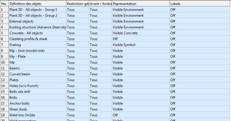 La première ligne identifiée comme correspondant à tous les critères contiendra la stratégie de labels. Cette configuration peut correspondre à la configuration requise. La recherche peut être interrompue ici, et Advance Steel ne passera pas à une autre ligne lors de la création de plans de détail de cet objet en particulier.