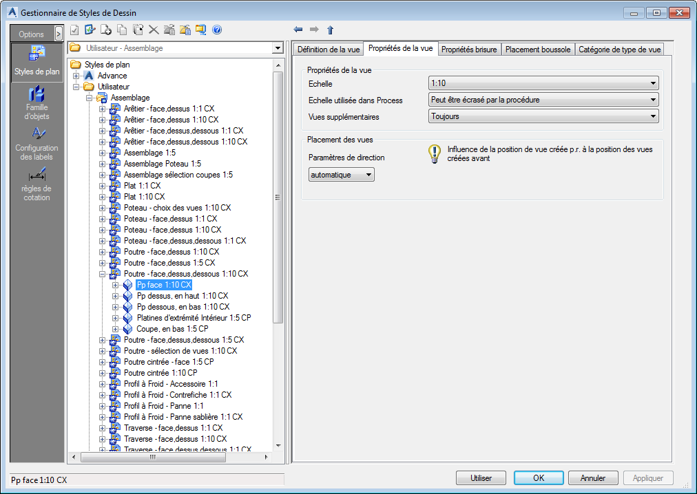 Le placement des vues est important pour la définition de la présentation des détails. La position de la vue peut être définie par rapport à la position de la vue précédemment créée. La première vue doit toujours être définie automatiquement, car elle est la référence pour les autres vues.