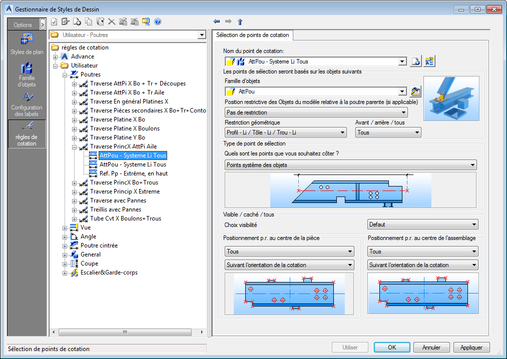 Une règle de sélection de points de cote contient des paramètres pour les objets du modèle et la restriction géométrique, le type de point, la position sur l'objet ou sur la pièce principale.