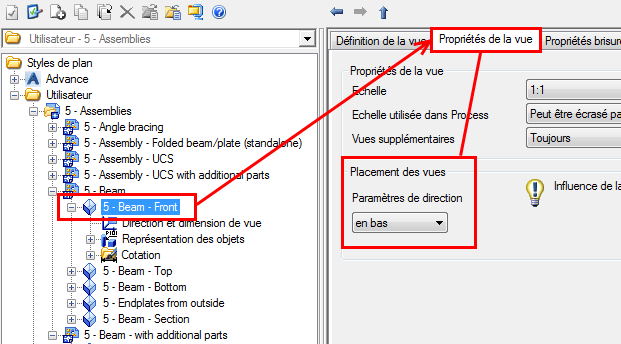 Par exemple, dans un style de dessin de poutre, la vue supérieure peut être positionnée en haut. Toutefois, si vous envisagez d'utiliser le même style de dessin de poutre pour un poteau vertical, la même vue supérieure sera placée à gauche de la vue principale disposée sur la gauche. L'aperçu schématique sous la liste de vues détermine où chaque vue sera placée par rapport à la vue principale :