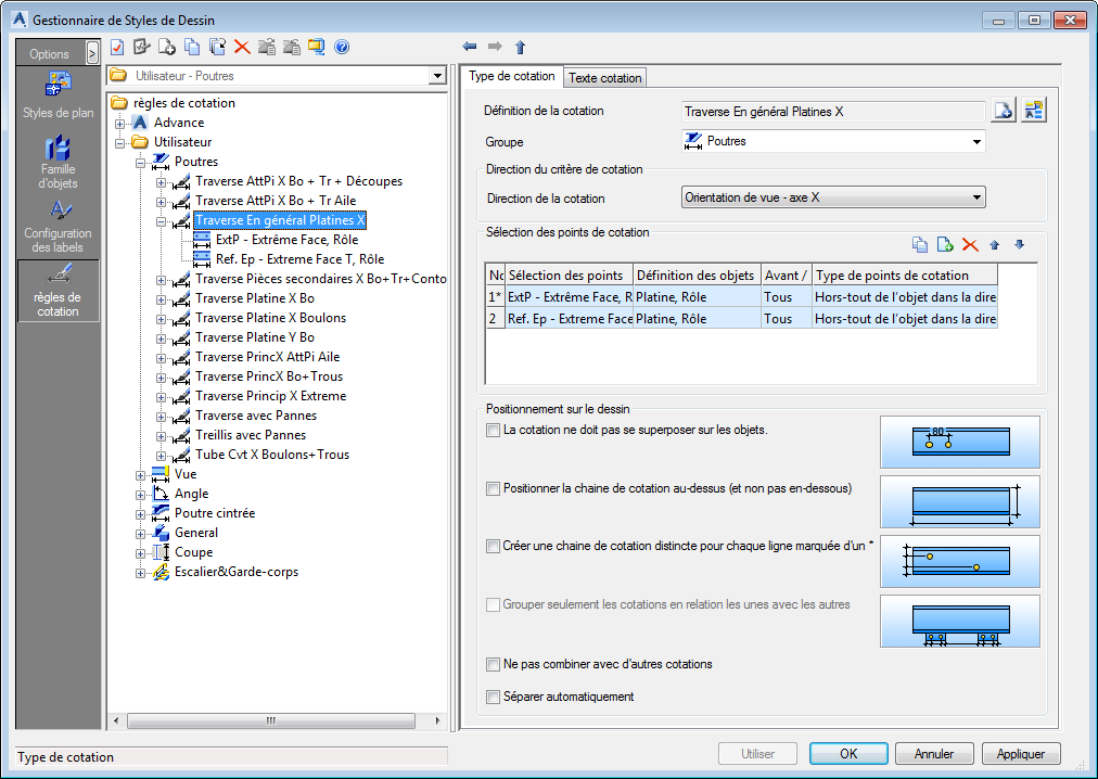 Définissez différentes options pour la direction de la cotation, la sélection des points de cotation ou la position de la chaîne de cotation à l'aide des propriétés de définition de cotation.