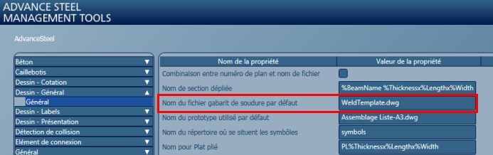 - Ouvrez l'application Management Tools et vérifiez la valeur par défaut lorsque le nom DWG du gabarit de symbole de soudure est spécifié.