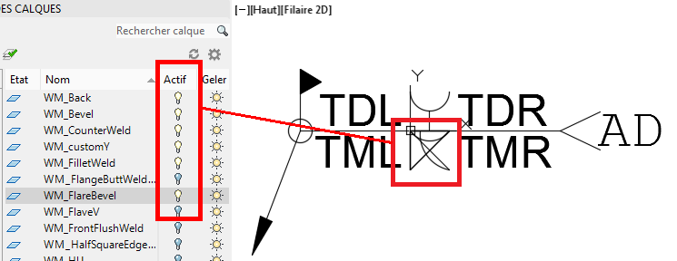 Remarque : A partir d'Advance Steel 2016, chaque symbole de soudure possède son propre calque.