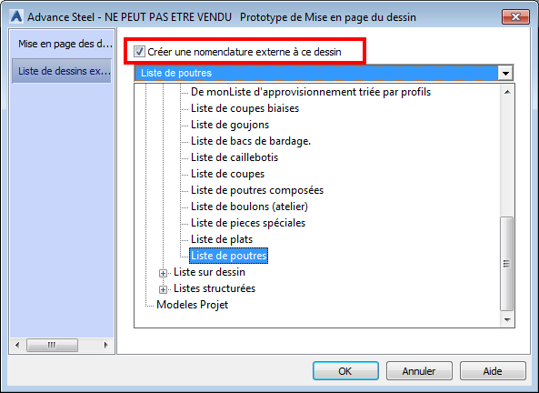 - Dans l'onglet "Liste de dessins externe", sélectionnez l'option "Créer une nomenclature externe à ce dessin".