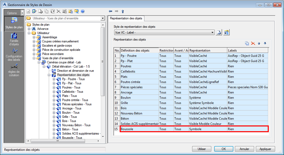 - Dans la partie droite de la boîte de dialogue (onglet Représentation de l'objet), cochez la case Afficher boussole. pour les poutres dans les vues 3D (5).