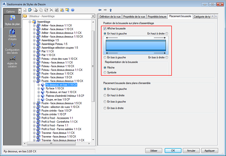 - A l'aide des options Placement boussole dans plans d'ensemble, vous pouvez définir le coin dans lequel le symbole est placé.