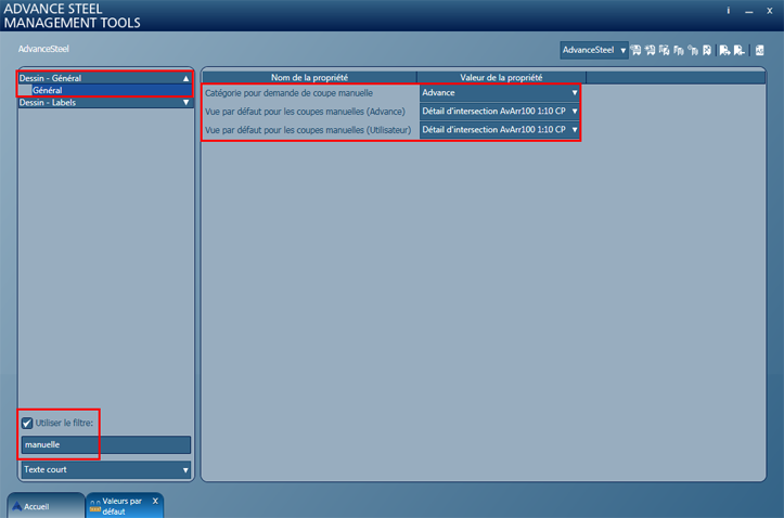 - Catégorie pour demande de coupe manuelle : cette option par défaut définit la catégorie depuis laquelle la vue détaillée est utilisée (Advance ou Utilisateur).