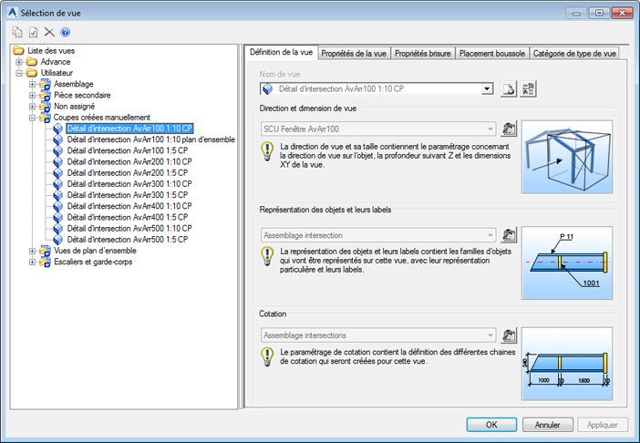 - Dans l'onglet Définition de la vue, remplacez le nom de la vue par celui défini dans la "Vue par défaut pour les coupes manuelles (Utilisateur)".