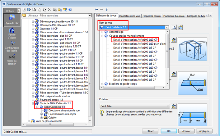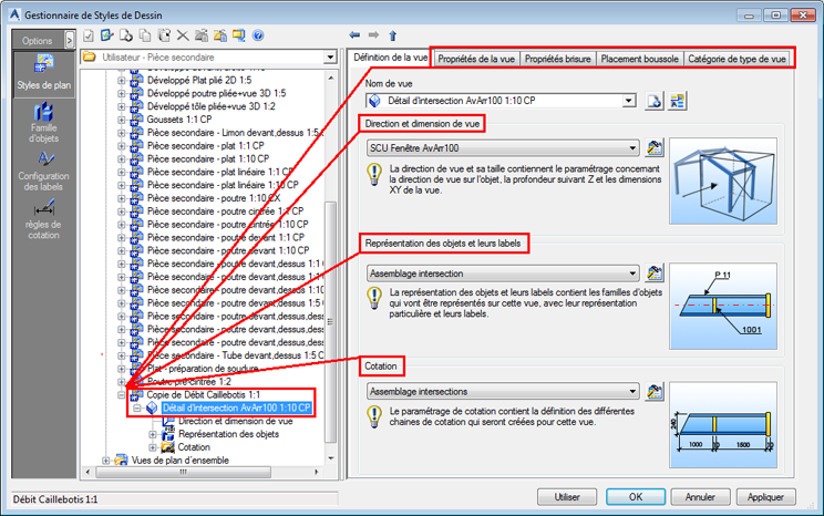 Une fois que le style de dessin contient la coupe manuelle par défaut, il est possible de modifier les propriétés de la vue, le style de représentation ou le style de cotation.