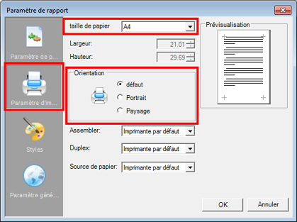 La plupart des listes de matériaux sont créées au format paysage pour la feuille DIN-A4. Pour changer le format, accédez à "Mise en page". Des modifications peuvent être apportées aux Paramètres d'impression (voir les schémas ci-dessous) :