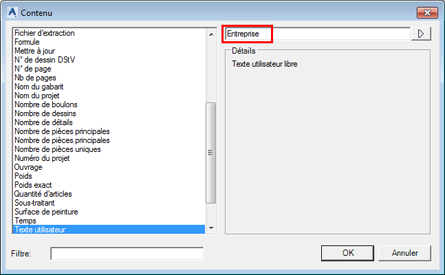 | Emplacement | (Emplacement du champ de texte, dans cet exemple dans l'en-tête de la nomenclature) |