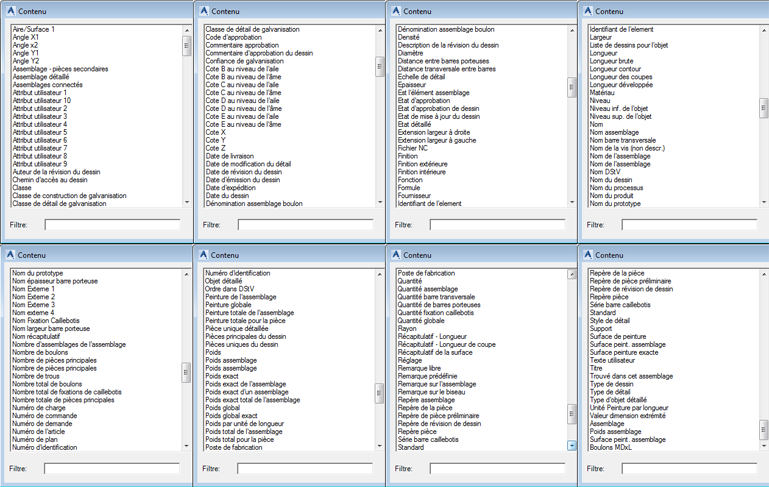 Listes de pièces Les éléments du modèle correspondant à la sélection sont répertoriés ici. |