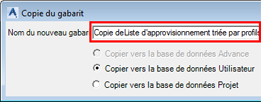 Sélectionnez un gabarit existant, copiez-le et renommez-le (dans cet exemple, une copie de la Liste d'approvisionnement triée par profils est renommée Copie deListe d'approvisionnement triée par profils).