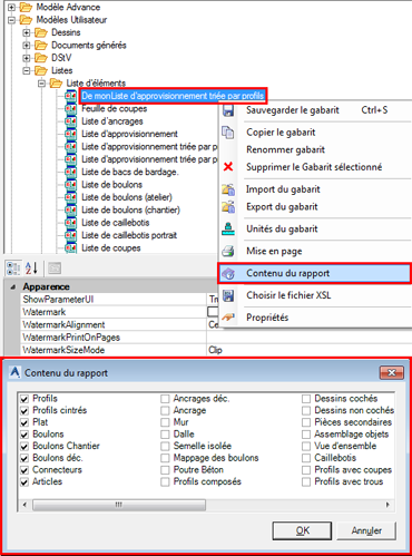 Outre l'ajustement visuel de la liste, vous pouvez ajouter ou supprimer des objets du modèle à la liste à l'aide de la fonction "Contenu du rapport".
