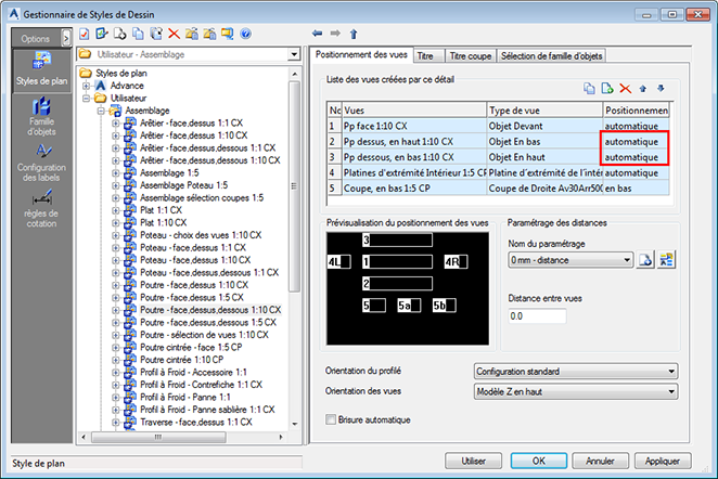 Dans chaque style de dessin, le paramètre de disposition de chaque vue doit être défini sur Automatique. Voir la figure ci-dessous. Les vues avec une disposition Automatique seront placées en fonction de la projection par défaut, mais les vues configurées différemment seront placées comme indiqué dans le style.