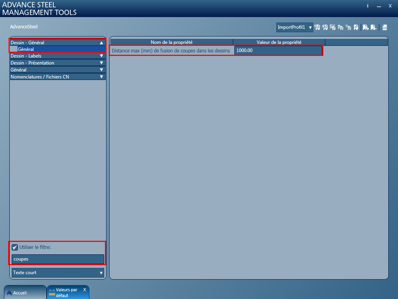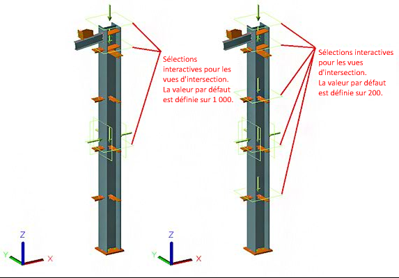 Le nombre de sélections interactives affichées dans le modèle par rapport à l'option "Vues d'intersection" dépend également de la valeur par défaut "Distance max (mm) de fusion de coupes dans les dessins". Ce paramètre se trouve dans la catégorie Settings\Defaults\Drawing-General de Management Tools.