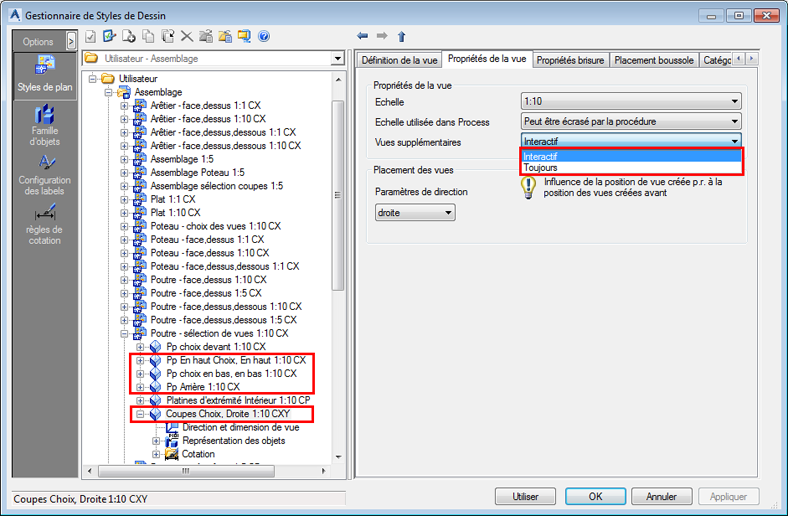 L'option Toujours / Interactif est disponible dans chaque onglet Propriétés de la vue. Les noms des vues définies sur Interactif contiennent généralement le terme "Option" et les styles de dessin contiennent l'expression "Sélection de vue".
