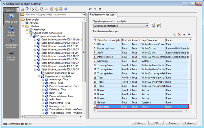 - Sélectionnez un style de dessin dans lequel vous souhaitez ajouter la représentation du caillebotis, par exemple, Intersection V - FR500 - Gr Mp PosSmGuid. Ensuite, accédez à la représentation des objets.