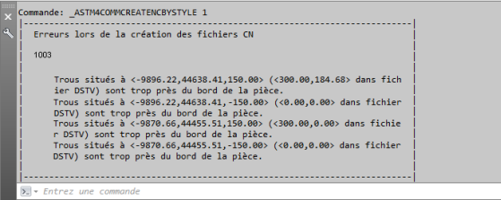 Lors de la création d'un fichier CN, un message d'erreur peut s'afficher sur la ligne de commande et le fichier CN est enregistré avec l'extension "err.". Dans ce cas, le fichier CN fonctionne, mais les coordonnées du trou affichent un message selon lequel elles sont trop proches de l'arête.