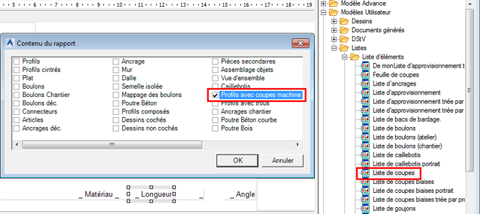 La valeur par défaut du contenu du rapport est définie sur "Profils avec coupes machine", mais cette option est disponible uniquement pour les éléments qui ne présentent pas plus de deux découpes.