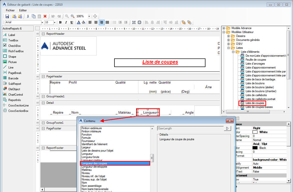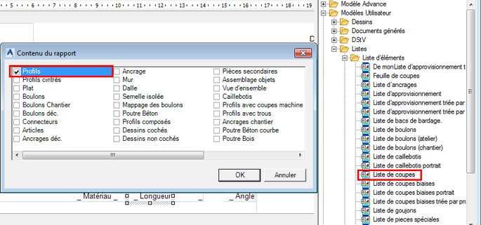 Pour les éléments qui possèdent plus de deux découpes, comme dans notre exemple, le contenu de rapport doit être défini sur "Poutres".