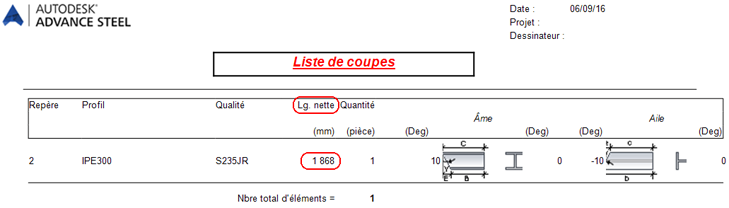 La longueur de découpe peut être utilisée et affichée dans la liste de coupes.