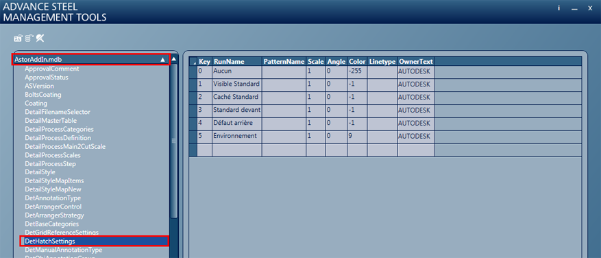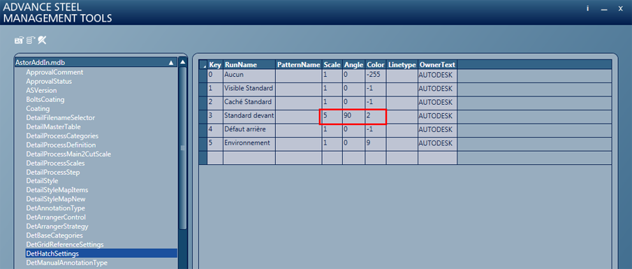 Remarque : Pour que la modification prenne effet sur les dessins de détail, il est nécessaire de les recréer. Un dessin mis à jour ne modifie pas les paramètres modifiés dans la table de base de données.