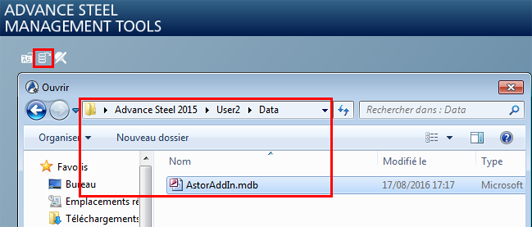 - Base de données AstorAddIn : ...\ProgramData\Autodesk\Advance Steel 2020\ [EXTENSION DE LA LANGUE D'INSTALLATION]\User2\Data\ (pour les styles de dessin utilisés de la catégorie Utilisateur).