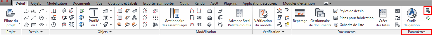 - à l'aide de l'option Mettre à jour les valeurs par défaut de l'onglet du ruban Outils Advance Steel, dans le volet Paramètres.