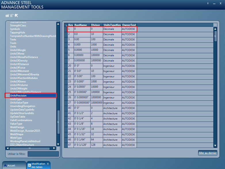 Unité 1 de la table UnitsPrecision de la base de données AstorBase : aucune décimale.