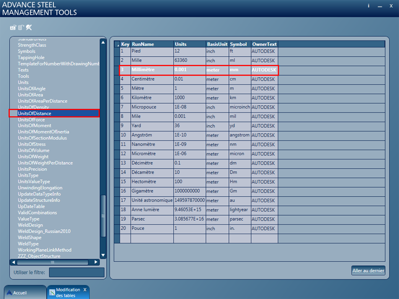 La première valeur est l'unité extraite des tables de la base de données AstorBase commençant par UnitOf... (par exemple, UnitsOfDistance pour une distance). La deuxième est le type d'unité extrait de la table UnitsType dans la base de données AstorBase. La troisième est la précision de l'unité extraite de la table UnitsPrecision de la base de données AstorBase. Dans l'exemple ci-dessus, nous avons utilisé [3,3,1], ce qui signifie : unité 3 de la table UnitsOfDistance de la base de données AstorBase : millimètre.