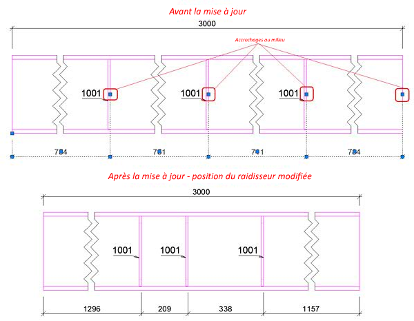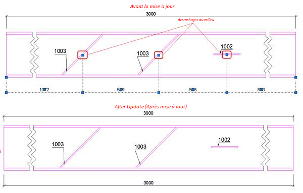 Tout point d'accrochage central supplémentaire au perçage/boulon choisi entre les extrémités, tant que nous ne les sélectionnons pas tous (voir le point suivant), est supprimé lors de la mise à jour sans que cela affecte les points d'accrochage corrects.