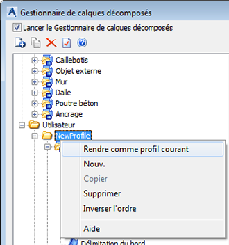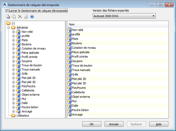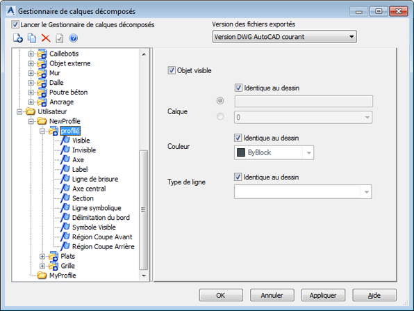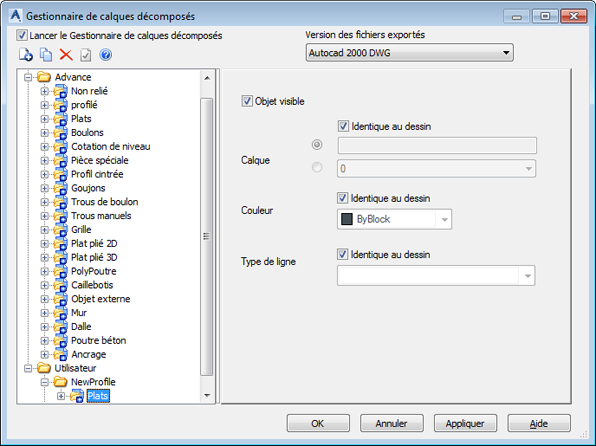 Avant de décomposer le plan sélectionné, vous pouvez définir les options de décomposition. Cette configuration utilisateur peut être stockée dans des profils définis pour être réutilisée dans vos futurs projets.