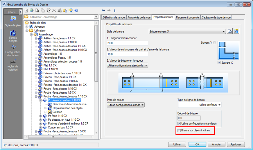 - Dans l'onglet Propriétés brisure de la vue concernée (par ex., Vue de face), désactivez l'option Brisure sur objets inclinés.