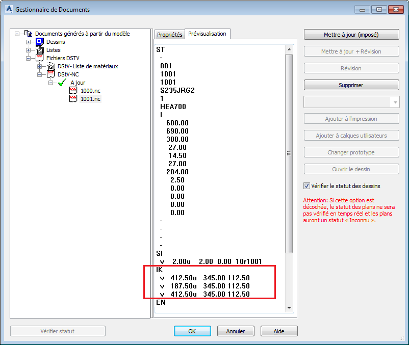 Selon la taille du diamètre du trou, Advance Steel permet de définir un trou comme un trou (Bloc BO) ou comme une coupe circulaire (bloc IK) dans les fichiers NC-DSTV.