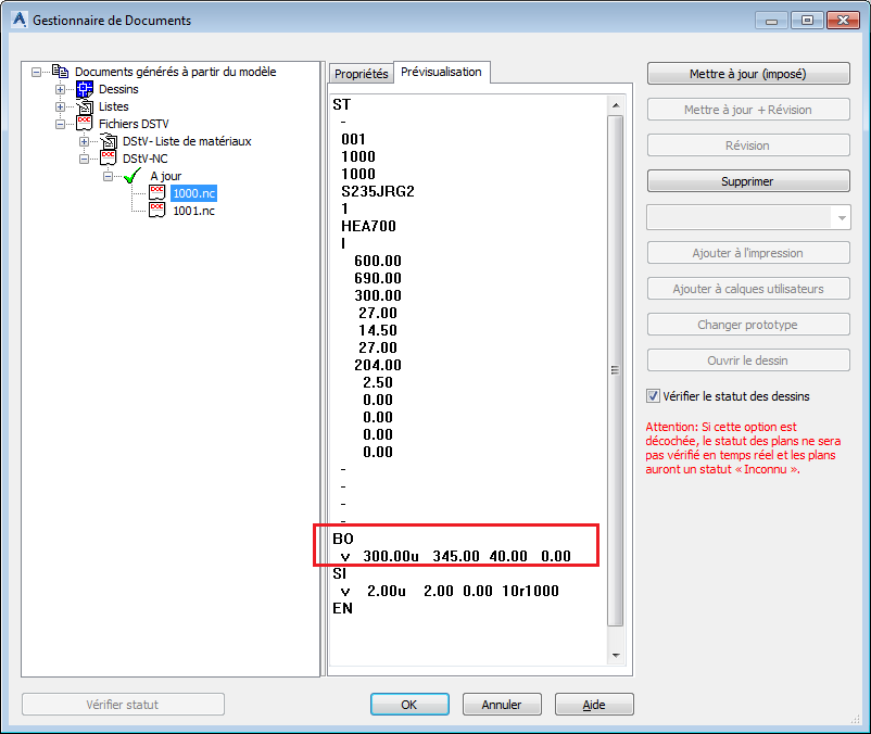Dans notre exemple, la valeur par défaut est 200, ce qui signifie que si la taille du diamètre du trou est inférieure à 200, le trou sera décrit dans un bloc BO (pour les trous), et si le diamètre du trou est supérieur à 200, le trou sera décrit dans un bloc IK (pour une coupe circulaire). Par conséquent, pour la poutre ayant un diamètre de trou de 40 sur son âme, vous obtiendrez le contenu de fichier NC-DSTV suivant :