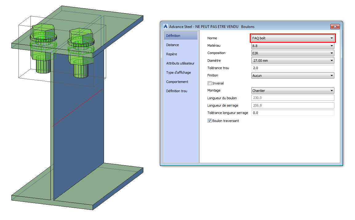 Avec Advance Steel, vous pouvez facilement définir de nouveaux boulons, à l'aide de l'application Management Tools. Pour une démonstration de workflow plus étendue, reportez-vous au séminaire en ligne Personnalisation des boulons, des ancrages et des goujons à l'aide d'Advance Steel 2017.