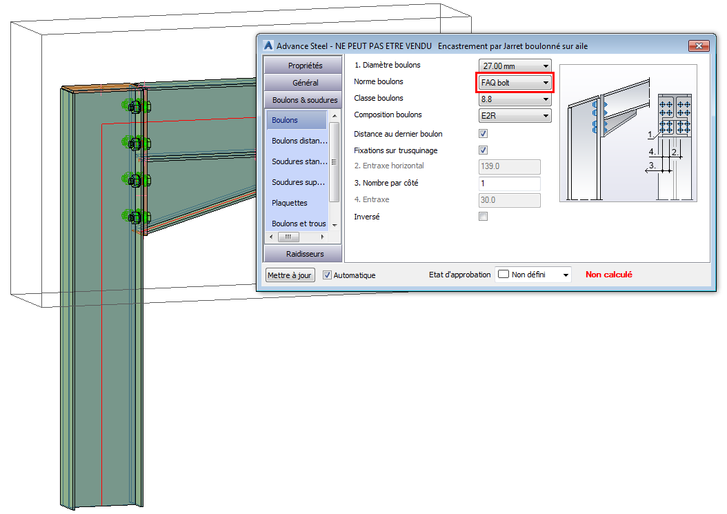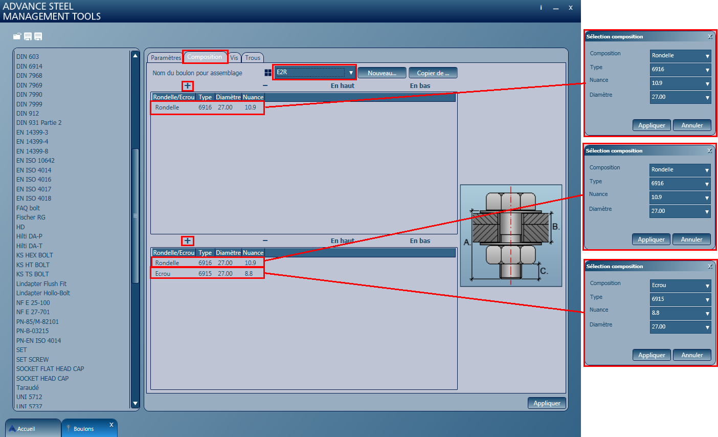 Par exemple, sélectionnez 8,8 pour la classe et 27,00 pour le diamètre.