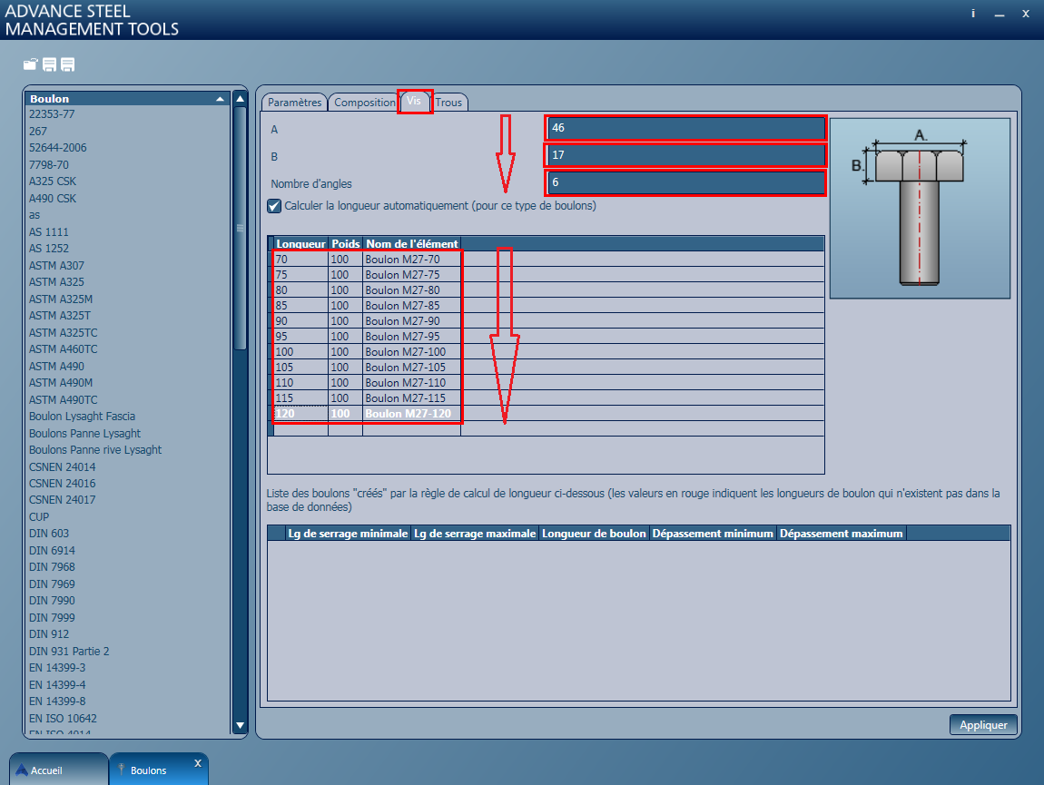 Ensuite, définissez chaque boulon par sa longueur, son poids et son nom de pièce, à l'aide de la table dédiée.